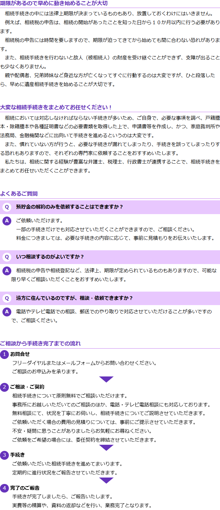 そんな労力のかかる相続手続きを専門家に依頼することは、普段の生活が大変で、ちょっと余裕がないなという方には特に有用と言わざるを得ません。
